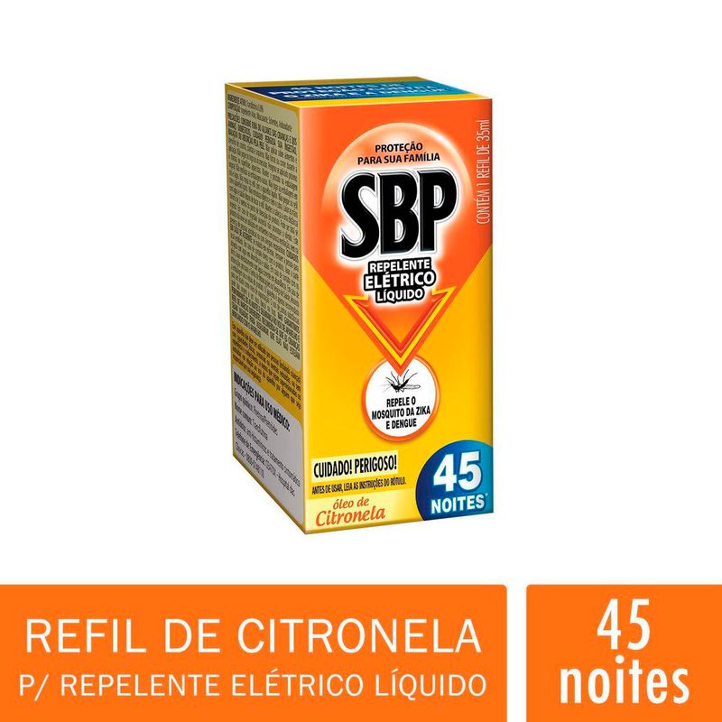 SBP Repelente Elétrico Líquido protege o ambiente por até 45 noites (considerando o uso de 8 horas por dia), possui cheiro de citronela e é eficaz contra mosquitos e pernilongos, incluindo o mosquito da Dengue, Zika e Chikungunya.