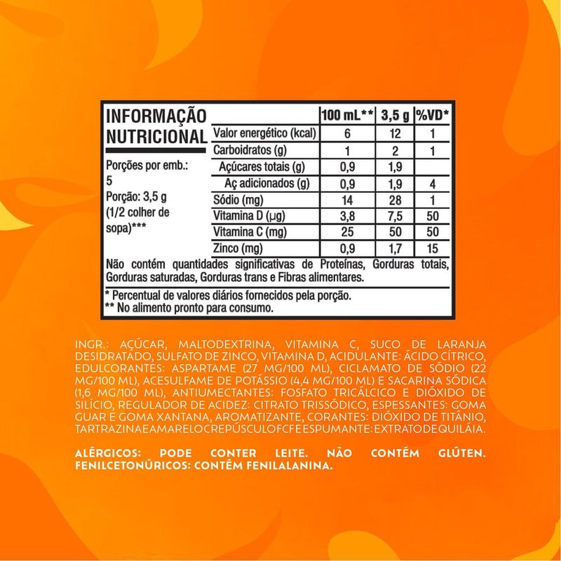 Compre agora o Refresco em pó Tang sabor Laranja. O novo Tang tem 100% da recomendação diária de vitamina C e D em 2 copos de 200ml e é fonte de zinco. Mais sabor e nutrientes! Faz 1 Litro para você e a família aproveitarem! Compre já!Tabela Nutricional e Alergênicos: Veja a tabela nutricional e ingredientes nas imagens.