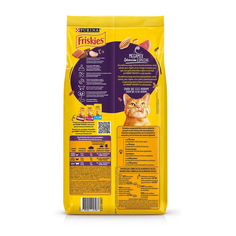 PURINA FRISKIES oferece uma aventura nutritiva e deliciosa a cada mordida para seu gato. É uma ração premium especial e agora sem corantes artificiais. Friskies é um alimento nutricionalmente completo e balanceado e possui tudo que seu gato precisa para se manter saudável. Contém formatos que brincam com sua imaginação para que ele tenha nutrição, sabor e diversão todos os dias.PURINA FRISKIES Megamix para gatos castrados tem uma deliciosa combinação de carne, salmão, peru, fígado, atum, frango e camarão e sua composição ajuda na manutenção do peso saudável. Possui também proteínas de alta qualidade, que ajudam a manter os músculos fortes. Contribui para manter o trato urinário saudável, em razão do equilíbrio adequado de minerais, além de oferecer vitaminas e minerais essenciais que os mantêm saudáveis.