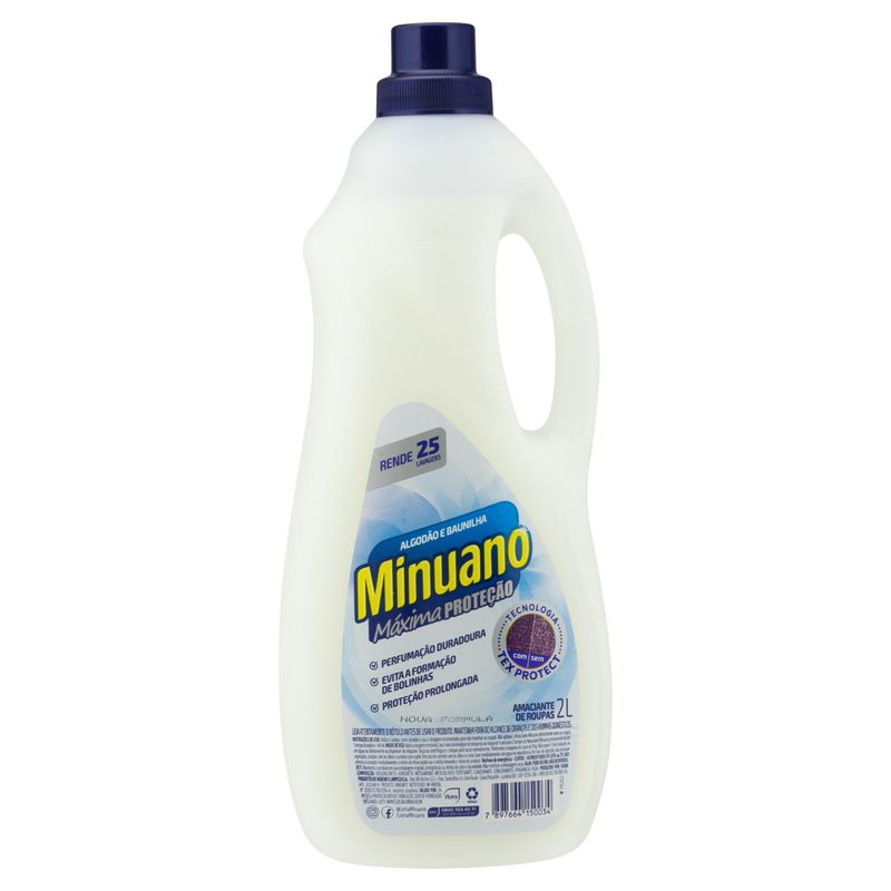 Praticidade e economia em tamanho família Com 2 litros de produto, o amaciante Minuano oferece uma quantidade generosa que atende às necessidades de lavagens frequentes. Ele proporciona a praticidade necessária para uma rotina de cuidados com as roupas, permitindo que você aproveite ao máximo cada ciclo de lavagem. A embalagem é pensada para facilitar o uso, garantindo que o produto possa ser dosado de forma eficiente.