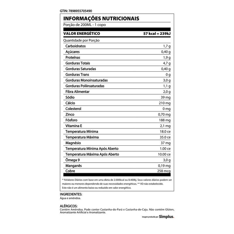 - Ingredientes: Água, castanha de caju, açúcar, amêndoa e estabilizante.