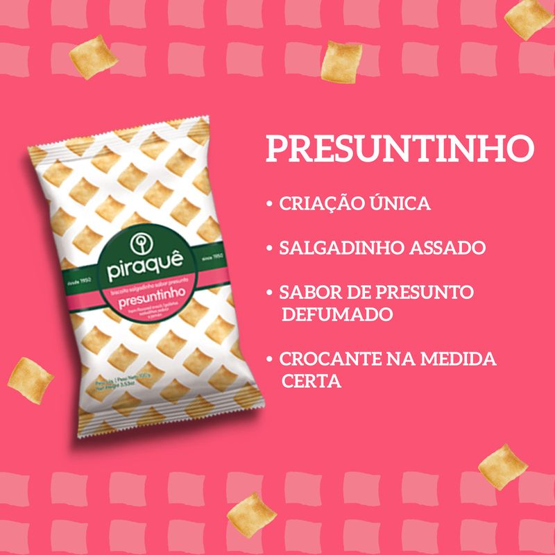 A Piraquê é reconhecida por sua tradição na produção de biscoitos de alta qualidade. Cada pacote do Biscoito Salgado Piraquê é elaborado com ingredientes selecionados, garantindo um produto que não só satisfaz o paladar, mas também respeita os padrões de qualidade que a marca representa. O sabor de presunto é cuidadosamente balanceado, oferecendo um toque especial que agrada a todos.