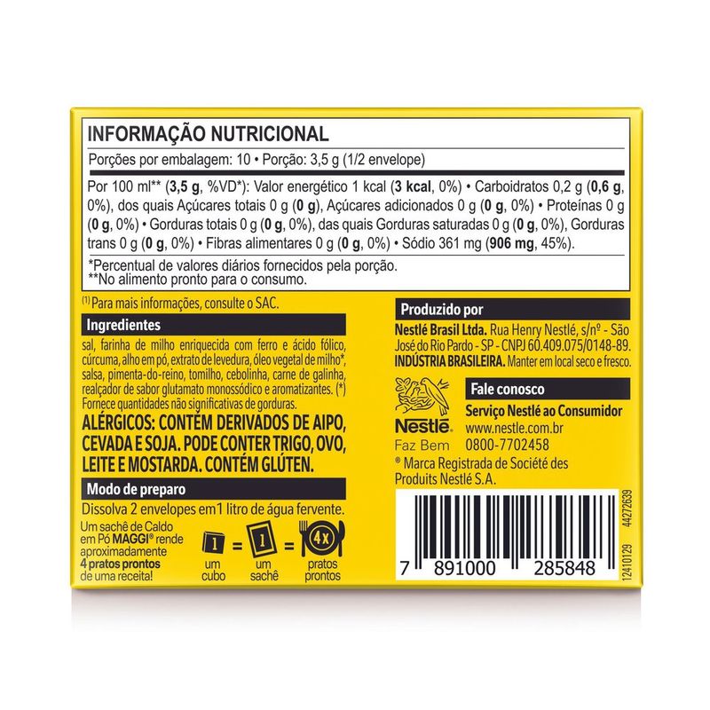 O tradicional Caldo Maggi® na versão pó e com 0% de gorduras totais. Esse delicioso caldo incrementa o sabor de galinha à sua receita. Ele dissolve muito mais fácil que o tablete comum.Pode ser usado em risotos, empadão de frango, ensopado de frango com legumes e muito mais!Feito com ervas e especiarias que você conhece, cuidadosamente selecionadas: alho, salsinha, pimenta, tomilho e cebolinha.