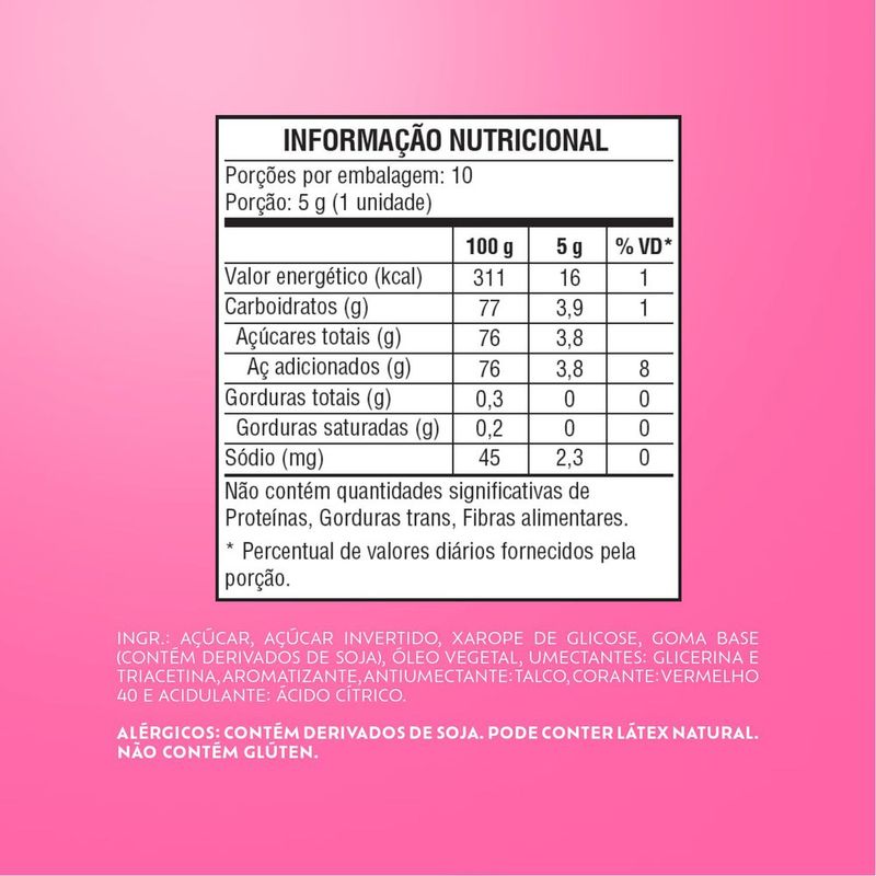 Cada goma é elaborada para oferecer uma mastigação prazerosa, com uma explosão de sabor que se destaca. O Tutti Frutti é uma combinação de frutas que traz uma sensação refrescante e doce, tornando cada pedaço uma verdadeira festa para o paladar. Essa goma é perfeita para quem aprecia um doce que não apenas satisfaz a vontade de comer algo gostoso, mas também traz um toque de nostalgia e diversão.