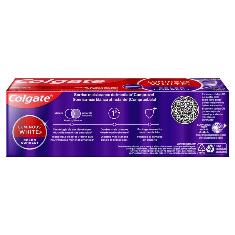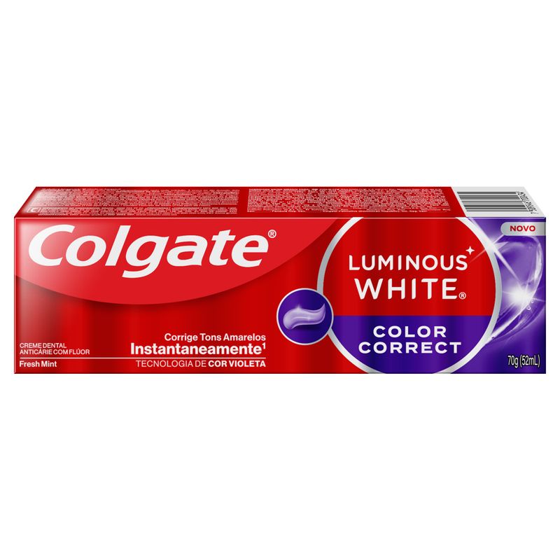 Com o creme dental Colgate Luminous White Color Correct obtém dentes mais brancos com sua fórmula corrige instantaneamente tons amarelados¹ e manchas nos dentes. Agindo como um clareador dental superior que protege o esmalte dos dentes sem danificar, graças à sua tecnologia de corante violeta, com efeito, clareador temporário e fácil de usar. ¹O efeito temporario.