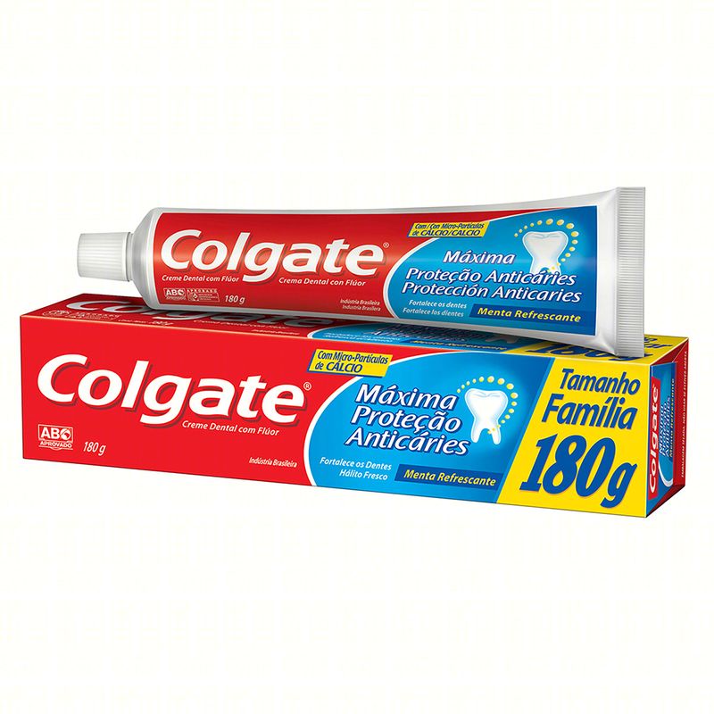 A pasta de dente Colgate Máxima proteção anticárie contém micropartículas de cálcio, que fortalecem os dentes e previnem a cárie, protegendo a sua saúde bucal e da sua família.