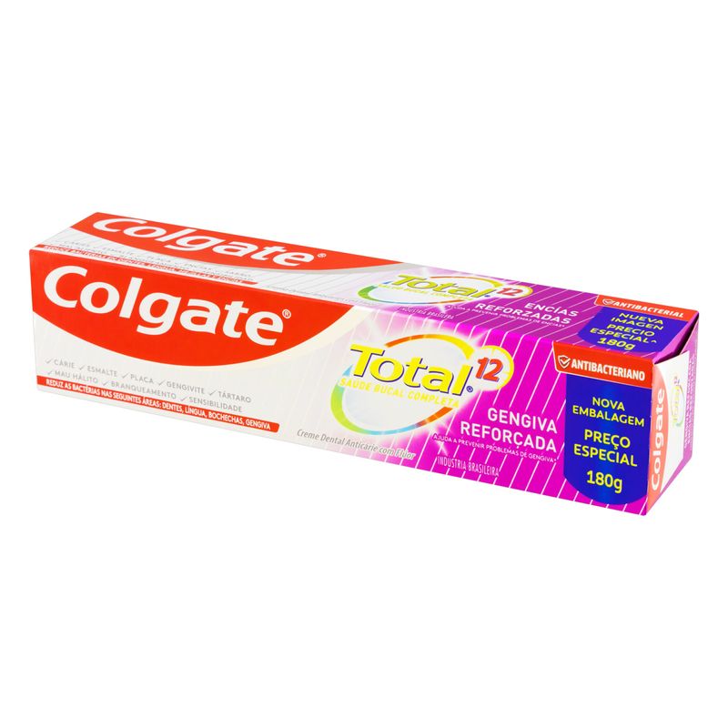 A pasta de dente Colgate Total 12 Gengiva Reforçada, com fórmula avançada e antibacteriana, garante até 12 horas de defesa ativa que reforça sua gengiva contras as bactérias com o uso contínuo. Ajuda a prevenir o sangramento gengival* (*O uso diário do regime Colgate Total 12 (creme dental e enxaguante bucal) remove a placa para ajudar a prevenir o sangramento gengival causado pelo acúmulo de bactérias. Produto cosmético sem ação terapêutica.)