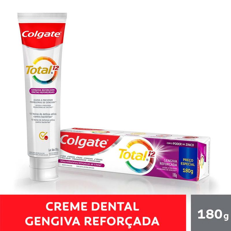 A pasta de dente Colgate Total 12 Gengiva Reforçada, com fórmula avançada e antibacteriana, garante até 12 horas de defesa ativa que reforça sua gengiva contras as bactérias com o uso contínuo. Ajuda a prevenir o sangramento gengival* (*O uso diário do regime Colgate Total 12 (creme dental e enxaguante bucal) remove a placa para ajudar a prevenir o sangramento gengival causado pelo acúmulo de bactérias. Produto cosmético sem ação terapêutica.)