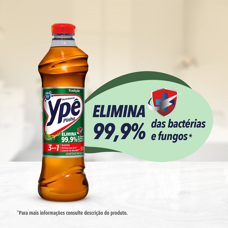 O Desinfetante Pinho Ypê Tradição elimina até 99,9% dos germes, bactérias e fungos do seu banheiro, deixando um perfume agradável de limpeza no ar. É indicado desde a faxina pesada até a limpeza diária da sua casa, podendo ser utilizado em grandes e pequenas superfícies como banheiros, ralos, pias, vasos sanitários, etc.