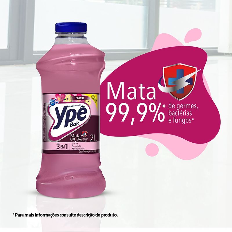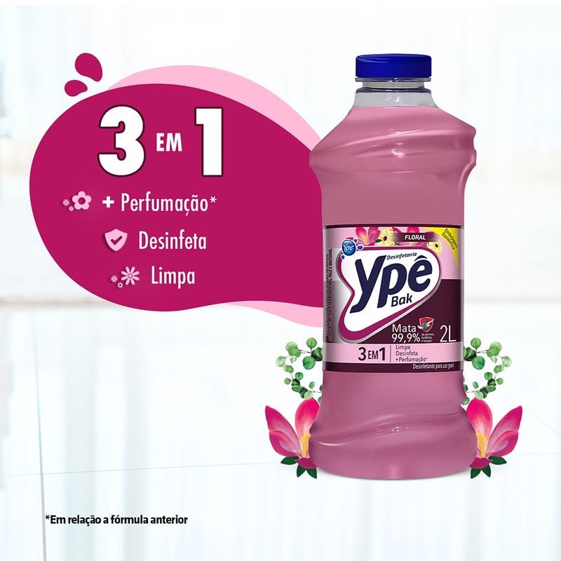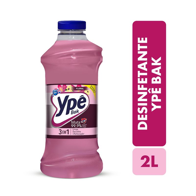 O Desinfetante Bak Ypê Floral limpa, desinfeta, elimina germes e bactérias, deixando perfume de flores em toda a sua casa. Ele pode ser utilizado em grandes superfícies como banheiro, pisos de quartos, salas, quintais, lavanderias, entre outros.