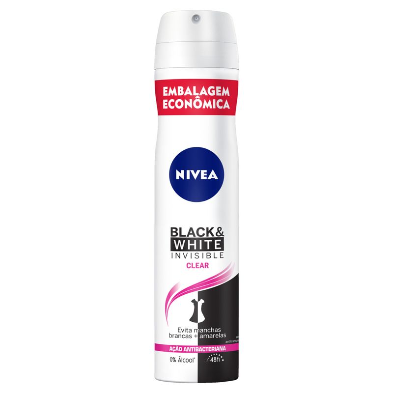O que é? NIVEA Desodorante Aerossol Black & White INVISIBLE Clear é um desodorante aerossol que promove máxima proteção de NIVEA contra o suor, mau odor, manchas, resíduos nas roupas e irritação, além de proteger a pele. Deixa as axilas suaves e macias, é fácil de aplicar, e possui proteção dermatologicamente testada. Para que serve? NIVEA Desodorante Aerossol Black & White INVISIBLE Clear proporciona a melhor proteção contra manchas e suor. Sua fórmula é 5x anti odor, suor, manchas, resíduos nas roupas e irritação na pele, com proteção prolongada de 72 horas. Evita manchas brancas em roupas pretas e manchas amarelas em roupas brancas. Benefícios e diferenciais: Anti-manchas com proteção de 72 horas A melhor proteção contra manchas e suor Fácil de aplicar Dermatologicamente testado Cuidado suave