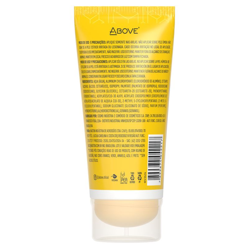 O Desodorante Creme Above Sport Men vem em uma embalagem prática de 50g, ideal para levar na bolsa ou na mochila. Para melhores resultados, aplique uma pequena quantidade nas axilas limpas e secas, espalhando uniformemente. A recomendação é usar diariamente, especialmente em dias quentes ou durante atividades físicas, para garantir a proteção prolongada.