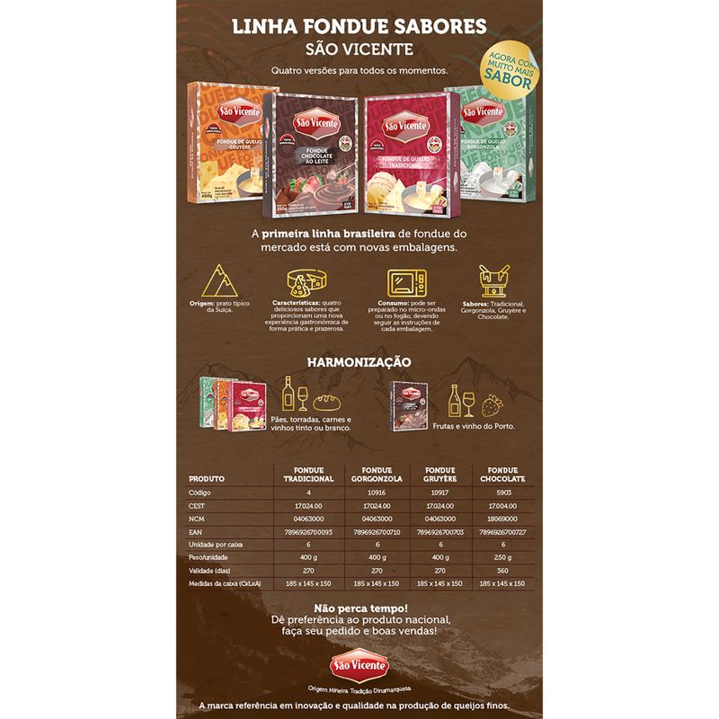 Produzido com ingredientes de alta qualidade, o Fondue de Queijo São Vicente é elaborado com uma combinação equilibrada de queijos que garantem um sabor marcante e uma textura irresistível. O processo de produção respeita as tradições, resultando em um produto que não apenas satisfaz o paladar, mas também traz a essência de um fondue autêntico. Cada porção é pensada para oferecer uma experiência gastronômica que encanta a todos.