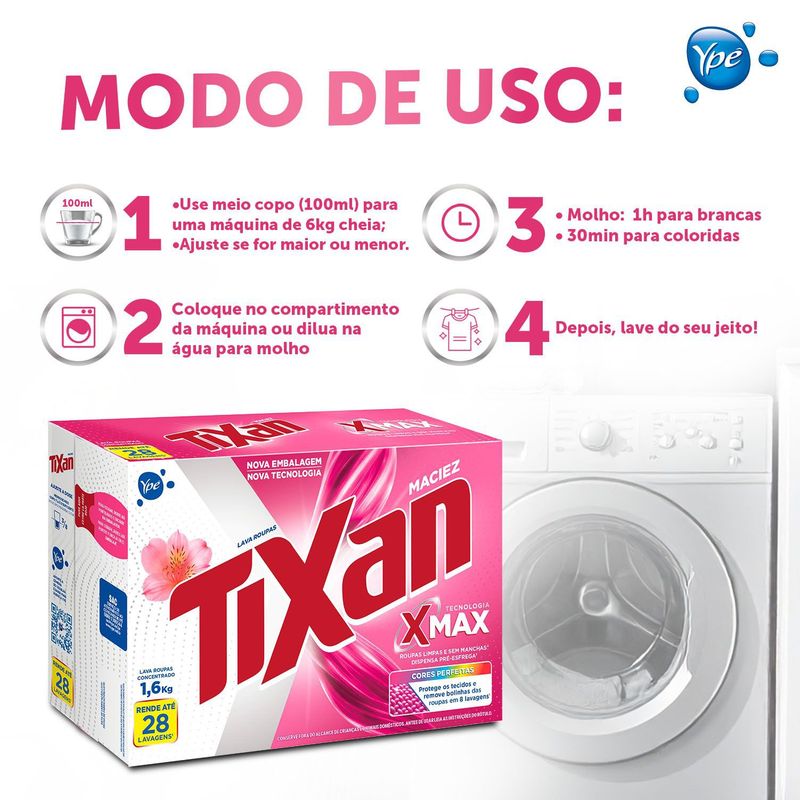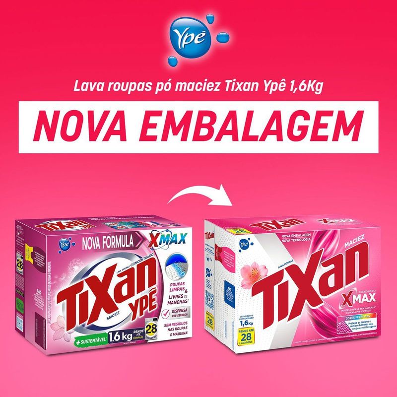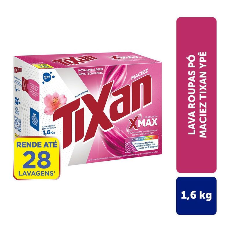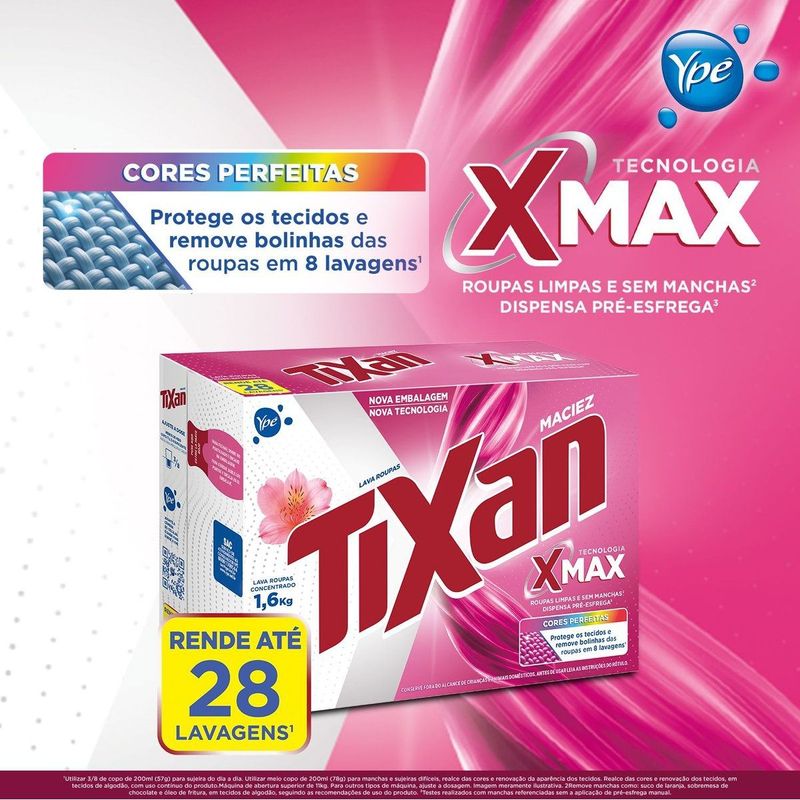 Lava Roupas Concentrado Tixan Ypê Maciez agora com NOVA FÓRMULA, com Bioenzimas¹ e Pó Ultrafino, sem deixar resíduos! Bioenzimas¹ para remoção das manchas² mais difíceis; Pó Ultrafino sem resíduos nas roupas e na máquina³. Mantendo os benefícios de Tixan que você já conhece: Cuida das Roupas; Perfume com Óleos Essenciais⁴; Hipoalergênico; +Sustentável⁵. Tixan Ypê Maciez, roupas limpas, livres de manchas². Carinho e cuidado que abraçam suas roupas.