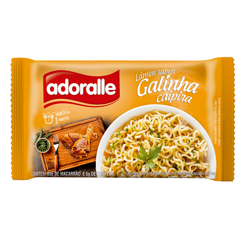 Macarrão Instantâneo Adoralle Galinha Caipira 85g – Sabor Tradicional Para Sua Refeição Prática e Saborosa O Macarrão Instantâneo Adoralle Galinha Caipira é a escolha ideal para quem busca um prato rápido, saboroso e que remete aos sabores da culinária caseira. Com apenas 85g, ele se encaixa perfeitamente na rotina agitada, permitindo preparar uma refeição quentinha em questão de minutos, sem abrir mão do gosto inconfundível do frango caipira. Sabor autêntico e fácil preparo Com um tempero especialmente desenvolvido para trazer à tona o sabor da galinha caipira, este macarrão instantâneo promete levar você a uma experiência culinária acolhedora. A preparação é simples: basta adicionar água fervente e aguardar alguns minutos, e seu prato estará pronto para ser saboreado. É uma ótima opção para almoços rápidos, jantares ou até mesmo lanches. Versatilidade na sua cozinha Além de ser prático, o Macarrão Instantâneo Adoralle pode ser personalizado com ingredientes adicionais, como legumes, proteínas ou temperos a gosto. Essa flexibilidade permite que você crie diversas combinações, deixando sua refeição ainda mais nutritiva e saborosa de acordo com suas preferências e necessidades. Ideal para qualquer ocasião Seja para um dia atarefado, quando o tempo é curto, ou para aqueles momentos em que não se quer perder muito tempo na cozinha, o Macarrão Instantâneo Adoralle Galinha Caipira é a solução perfeita. Ele se destaca como uma opção saborosa e acessível que se ajusta a diferentes momentos do seu dia, garantindo que você tenha sempre um lanche ou refeição à mão. A proposta de trazer conforto e sabor em um pacote compacto é o que torna esse produto uma escolha tão especial no dia a dia.