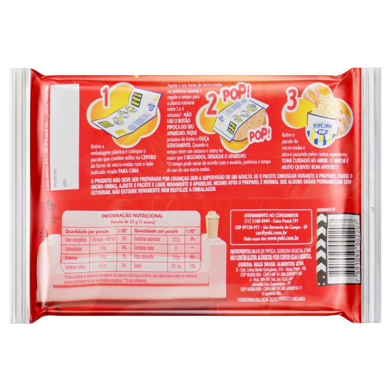 Pipoca Micro Yoki Natural 100g – Sabor e Praticidade na Sua Casa Uma opção deliciosa para seus momentos de lazer A Pipoca Micro Yoki Natural é a escolha perfeita para quem busca um lanche saboroso e prático. Com 100g de pipoca, este produto é ideal para preparar em casa, seja para uma sessão de cinema, uma reunião com amigos ou um momento de descontração em família. O sabor natural da pipoca proporciona uma experiência leve e crocante, que agrada a todos. Fácil preparo para todos os gostos Com a Pipoca Micro Yoki, você pode desfrutar de um lanche quentinho em poucos minutos. Basta colocar o pacote no micro-ondas e aguardar o tempo indicado na embalagem. O resultado é uma pipoca estourada, leve e saborosa, pronta para ser saboreada. É uma opção que combina praticidade e sabor, perfeita para quem tem uma rotina agitada, mas não abre mão de um lanche gostoso. Versatilidade para diferentes ocasiões Essa pipoca é uma excelente opção para diversas ocasiões. Seja para um filme em casa, uma festa de aniversário ou um lanche da tarde, a Pipoca Micro Yoki Natural se adapta a qualquer momento. Você também pode incrementar a pipoca com temperos ou acompanhamentos de sua preferência, tornando-a ainda mais especial e personalizada. Informações e características do produto A Pipoca Micro Yoki Natural vem em uma embalagem de 100g, ideal para porções individuais ou para compartilhar. É um produto livre de aditivos artificiais, permitindo que você aproveite o sabor autêntico da pipoca. Além disso, a embalagem é prática e fácil de armazenar, garantindo que você tenha sempre um lanche à mão.