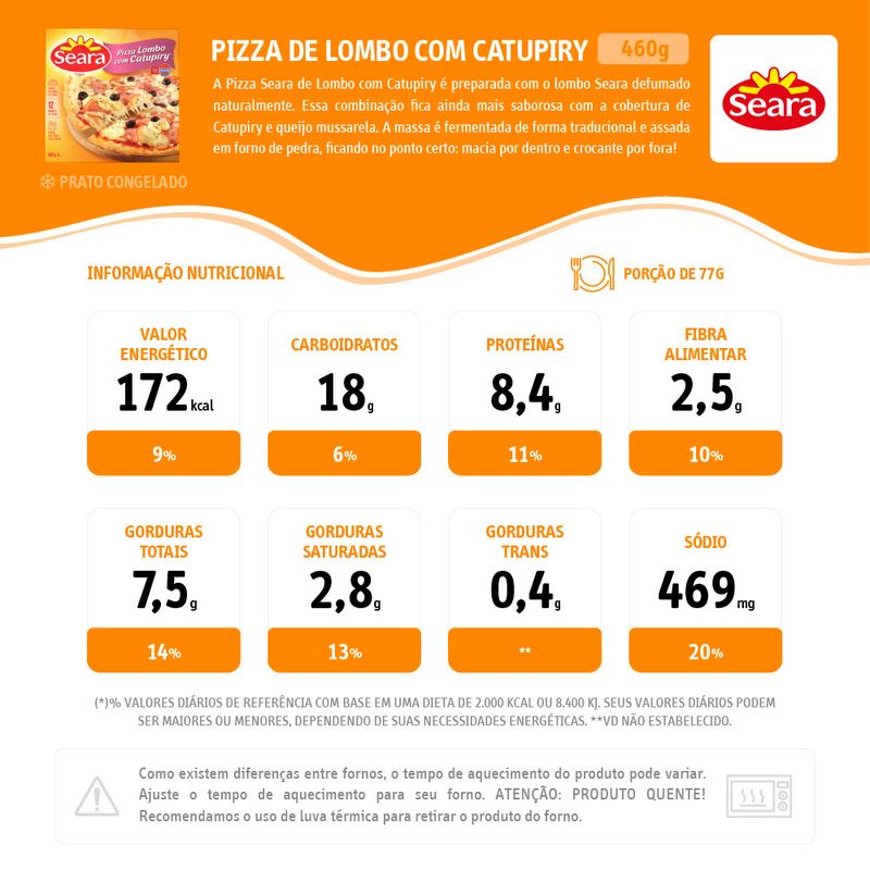 Perfeita para ser servida em diversas ocasiões, a Pizza Seara Lombo com Catupiry é uma escolha versátil. Seja em um jantar descontraído, em uma festa de aniversário ou até mesmo em um encontro casual, ela se adapta a qualquer situação, agradando tanto adultos quanto crianças.