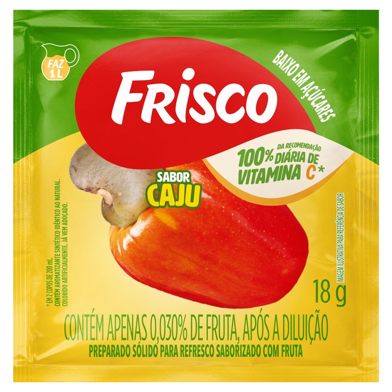 Refresco em Pó Frisco Caju 18g – Sabor e Frescor a Cada Gole Uma explosão de sabor O refresco em pó Frisco de caju traz toda a essência da fruta para o seu dia a dia. Com cada pacote de 18g, você pode preparar uma bebida deliciosa e revigorante, perfeita para os dias ensolarados ou para acompanhar momentos especiais com amigos e família. O sabor autêntico e característico do caju é ideal para quem deseja uma bebida saborosa, que estimula os sentidos e proporciona uma experiência refrescante. Praticidade na medida certa O preparo é extremamente simples e rápido. Basta dissolver o conteúdo do sachê em água e misturar até que o pó esteja totalmente incorporado. O resultado é um refresco que pode ser consumido gelado ou em temperatura ambiente, tornando-se uma opção versátil para esses momentos de sede ou para acompanhar refeições. A embalagem compacta é ideal para levar a qualquer lugar, seja para um piquenique, uma festa ou até mesmo para o dia a dia em casa. Alta qualidade Frisco é uma marca reconhecida por sua qualidade e sabor autêntico, garantindo um produto que respeita os padrões de fabricação e ingredientes selecionados para proporcionar uma bebida que é sinônimo de frescor e prazer. Cada gole é uma experiência gostosa, trazendo a alegria do caju à sua mesa. Desfrute do Refresco em Pó Frisco de caju e transforme seus momentos em refrescantes experiências!
