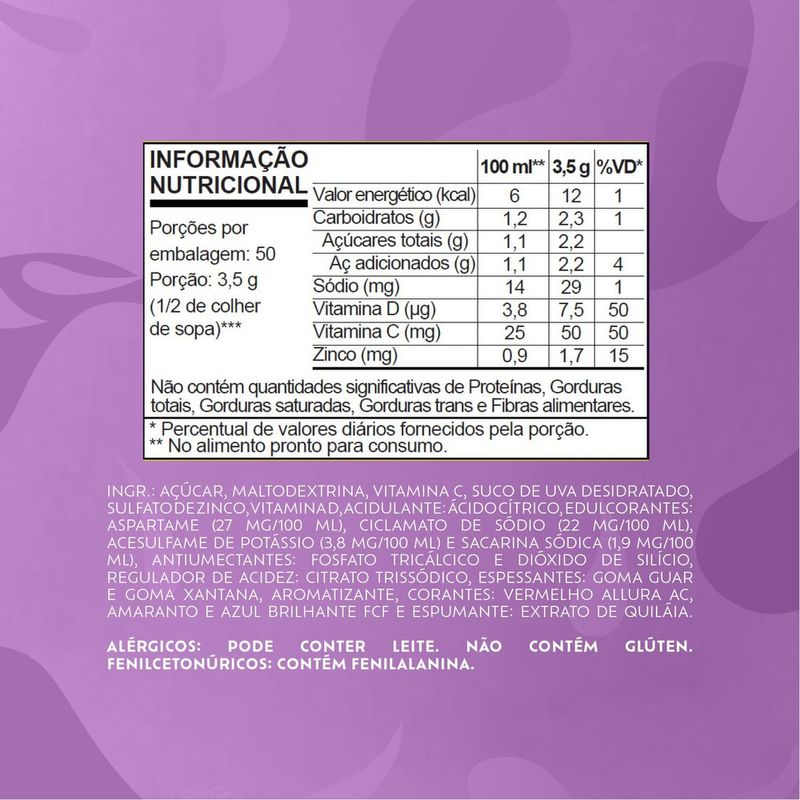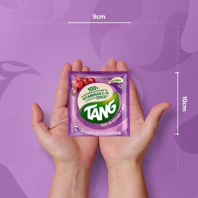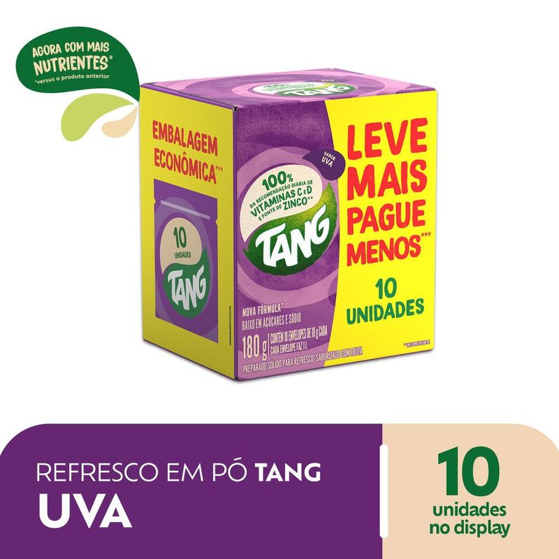 Compre agora o Refresco em Pó Tang Uva: além do sabor marcante, ele é enriquecido com vitaminas C e D, essenciais para fortalecer o sistema imunológico. Além disso, você também estará recebendo uma fonte de zinco, um mineral vital para o seu bem-estar. Compre já e Leve 10 Por Preço Especial. Tabela Nutricional e Alergênicos: Veja a tabela nutricional e ingredientes nas imagens.