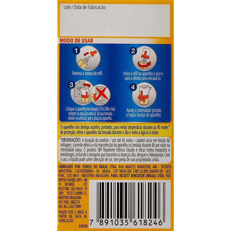 SBP Repelente Elétrico Líquido protege o ambiente por até 45 noites (considerando o uso de 8 horas por dia), possui cheiro de citronela e é eficaz contra mosquitos e pernilongos, incluindo o mosquito da Dengue, Zika e Chikungunya.