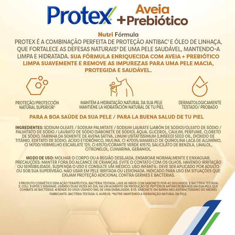 O Sabonete em Barra Protex Aveia combina a proteção antibacteriana de Protex com os benefícios naturais da aveia. Sua fórmula com óleo de linhaça penetra na pele e fortalece suas defesas naturais, protegendo você de dentro para fora.