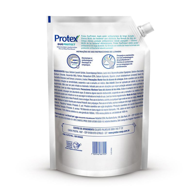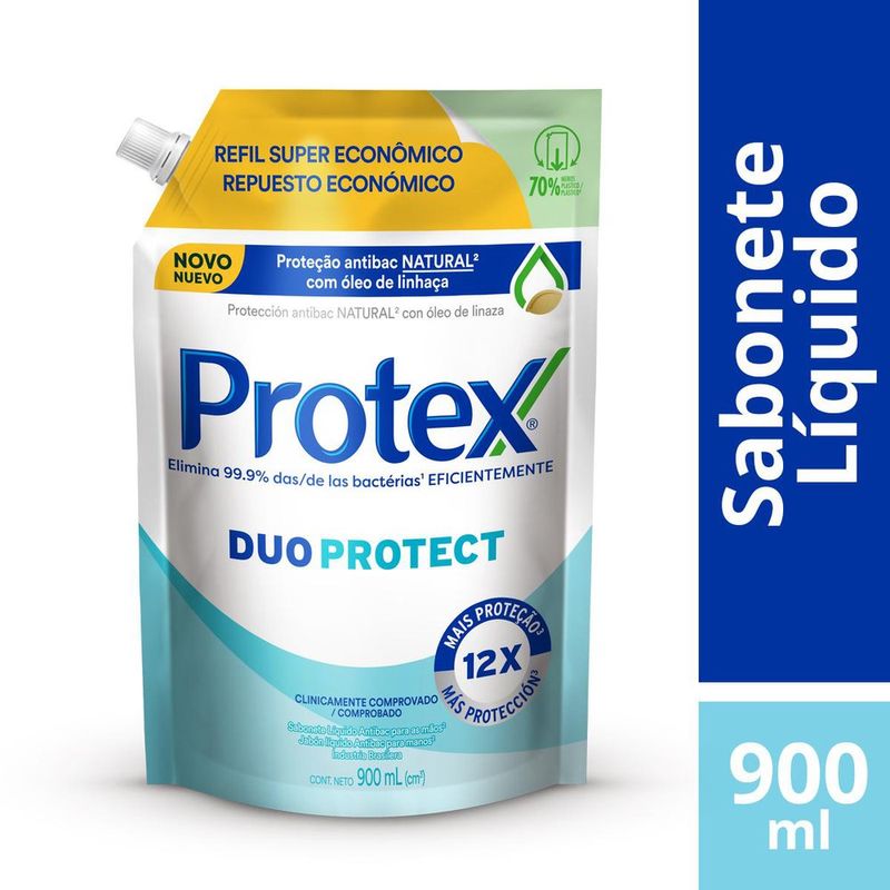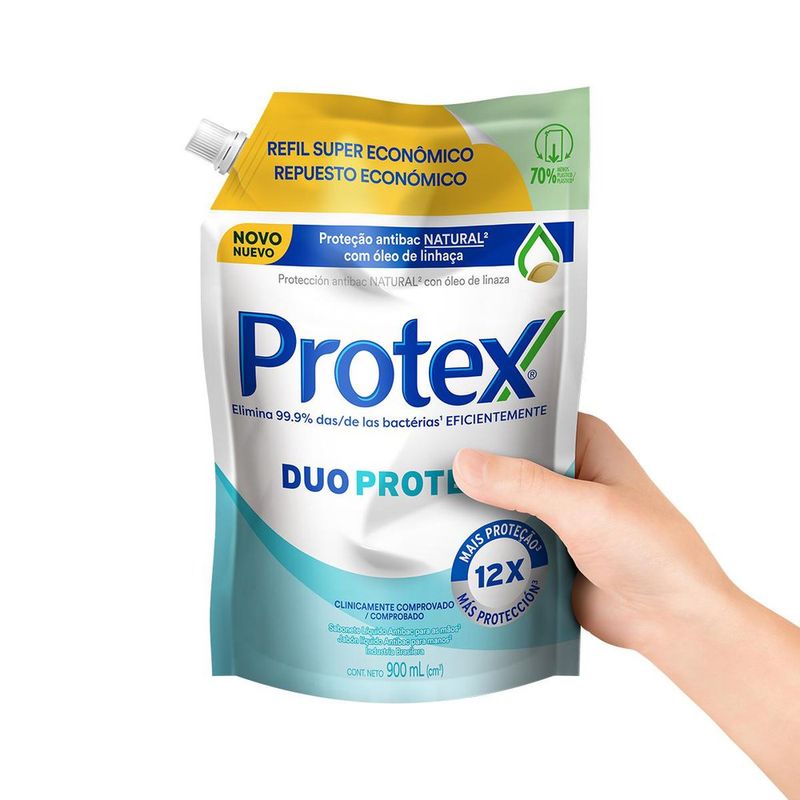 O Sabonete Líquido Protex Duo Protect oferece proteção antibacteriana natural com óleo de linhaça e elimina 99,9% das bactérias. O sabonete líquido para as mãos também garante proteção por até 12 horas.