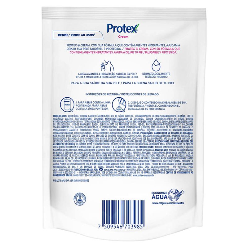 Sabonete Líquido Protex Cream Refil 200ml – Cuidado e Proteção para Sua Pele Experiência de limpeza suave O sabonete líquido Protex Cream foi desenvolvido para proporcionar uma limpeza eficaz e ao mesmo tempo suave para a pele. Este refil de 200ml é uma excelente opção para quem busca praticidade, mantendo seus dispensers sempre abastecidos com um produto de qualidade reconhecida. Com sua fórmula especial, promove uma sensação refrescante e limpeza profunda, removendo impurezas e deixando a pele com um aroma agradável. Benefícios da fórmula Protex O Sabonete Líquido Protex Cream é formulado para oferecer proteção bacteriana, sempre cuidando do bem-estar da sua pele. Ele ajuda a combater germes e bactérias, sendo uma escolha ideal para o uso diário. Com pH balanceado, é apropriado para todos os tipos de pele, garantindo que mesmo os mais sensíveis possam utilizar sem preocupações. O produto é enriquecido com agentes hidratantes que ajudam a evitar o ressecamento, promovendo uma sensação de maciez após o uso. Ideal para toda a família Prático e versátil, este refil de sabonete líquido é ideal para uso em casa, no trabalho ou até mesmo em ambientes públicos, como escolas e academias. Sua apresentação em embalagem de 200ml facilita o armazenamento e a troca, permitindo que você mantenha sempre à mão um sabonete de qualidade. Além disso, o refil contribui para reduzir o desperdício, sendo uma escolha consciente e sustentável.