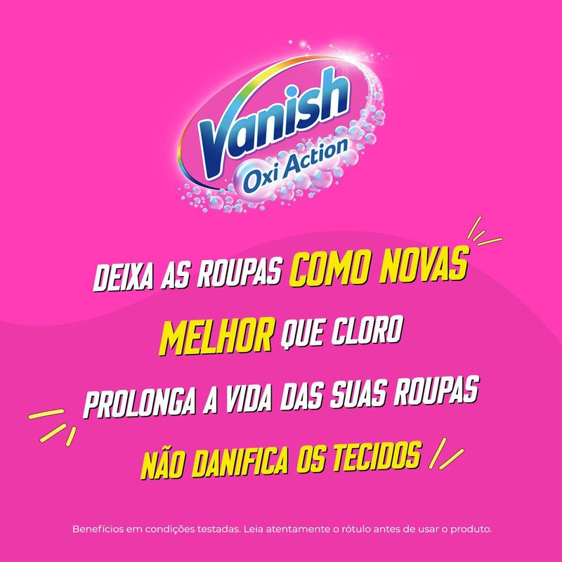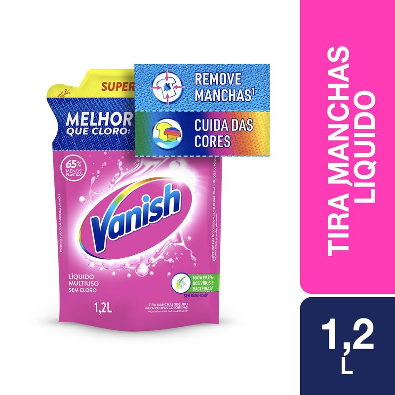 Vanish Líquido Multiuso é o tira manchas melhor que cloro. Ele remove manchas difíceis e cuidadas cores das roupas coloridas, sem esforço. Ele mata 99,9% de vírus e bactérias, mantém as cores vivas, deixando as roupas como novas por mais tempo. Compre já!