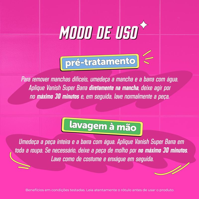 Novo vanish super barra foi especialmente formulado com enzima para que seja eficaz até na remoção das manchas mais difíceis, não contendo cloro ou abrasivos, é poderoso contra as manchas e delicado com os tecidos.